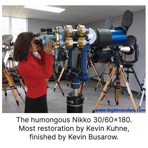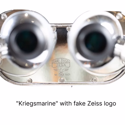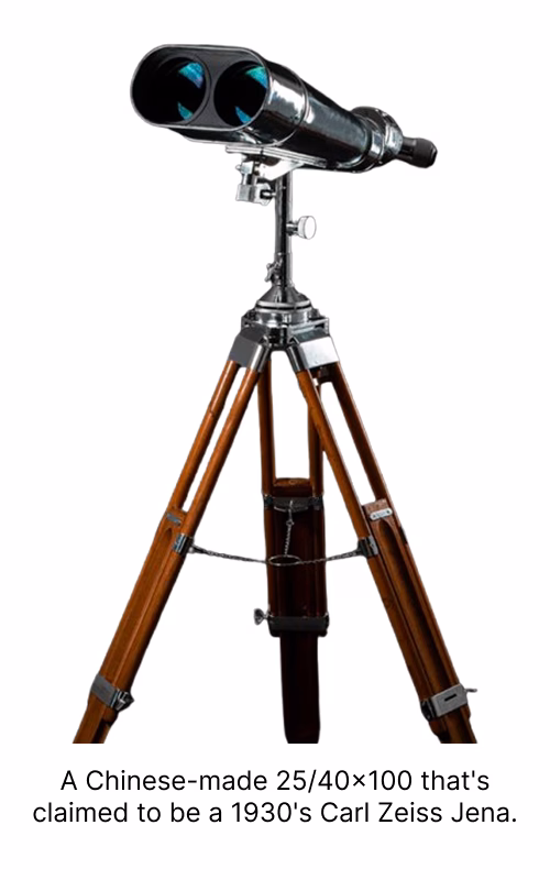 There are several reputable companies out there that sell restored military binoculars, as well as modern reproductions. In fact, these sellers are mostly selling reproductions, which is understandable as authentic instruments are becoming increasingly-rare (and expensive). They sometimes are very subtle about the fact that they’re selling reproductions, so read the full descriptions carefully. These reproductions use the same standard optical glass that is found in most modern binoculars selling for well under $500. So when you spend thousands for one of these, you’re paying mostly for the bling. In fact I am also friends with, and work closely with, the person that does most of the restorations for one of more reputable sellers of these blinged-out authentic and reproduction binoculars. Only one seller (as far as I know) is passing off brand new binoculars as authentic WWII binoculars, and they’re going to great lengths to blatantly deceive. The Oberwerk 25/40×100 is made in our partner’s assembly plant in Kunming, China. But because this model has been available in China since the 1960’s, there are other factories in China that can produce the same model. The main difference is we supply it with our TR3 hardwood tripod, which we build right here in Dayton. Versions from other Chinese suppliers come with a Chinese-made wooden tripod (that is far inferior to the TR3). So I was astounded to see that one seller of “authentic WWII military” binoculars is claiming the Chinese 25/40×100, complete with the Chinese tripod, is a “WWII Carl Zeiss Kriegsmarine Binocular”, circa- 1940, country of origin- Germany!