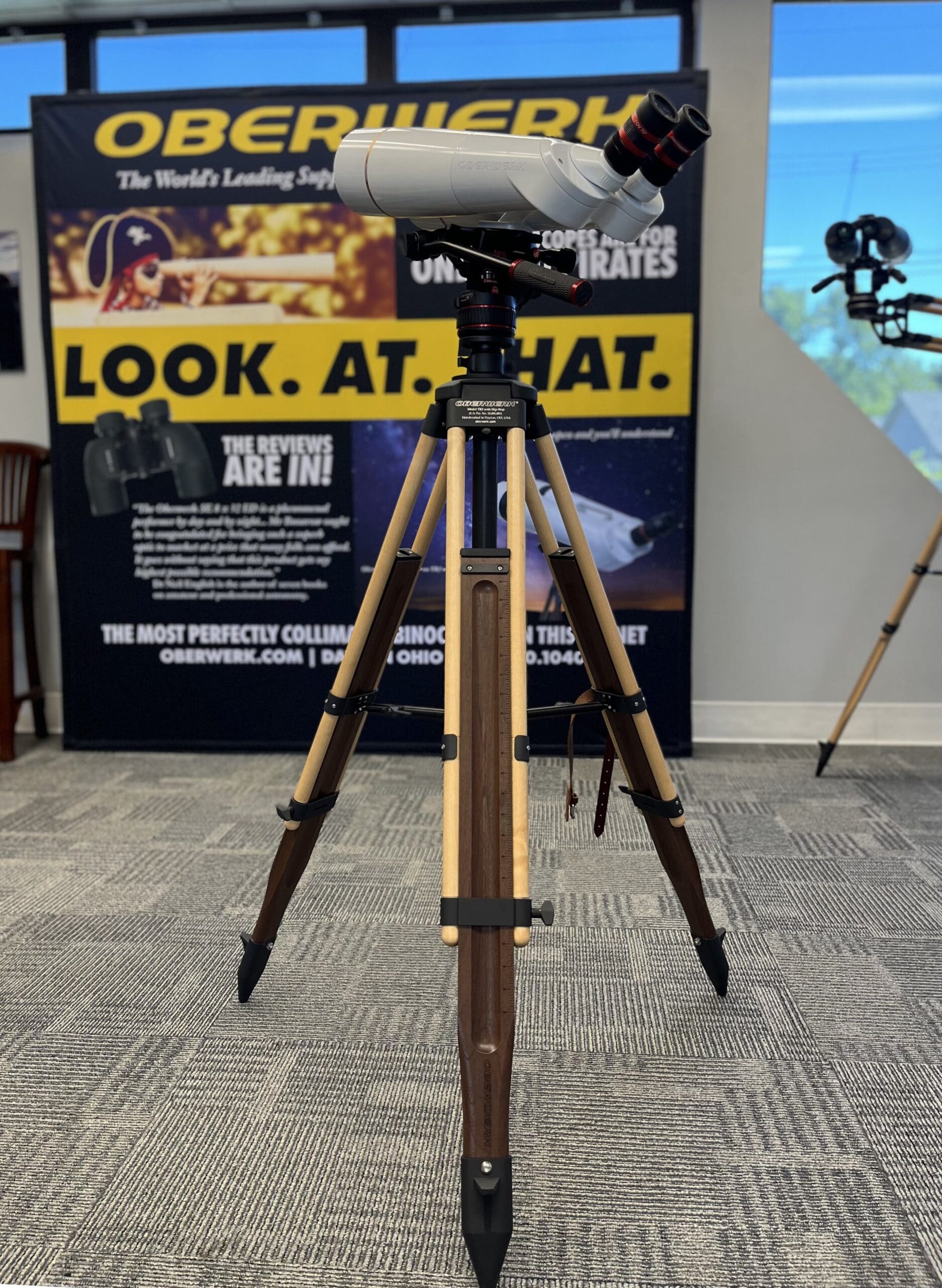 ….I purchased my TR3 with the carbon riser in walnut. I have had it now for a couple of years and it has seen duty multiple times a week use since then. It supports a Manfrotto fluid head and Oberwerk’s very own and excellent BT-100XL SD binocular telescope.