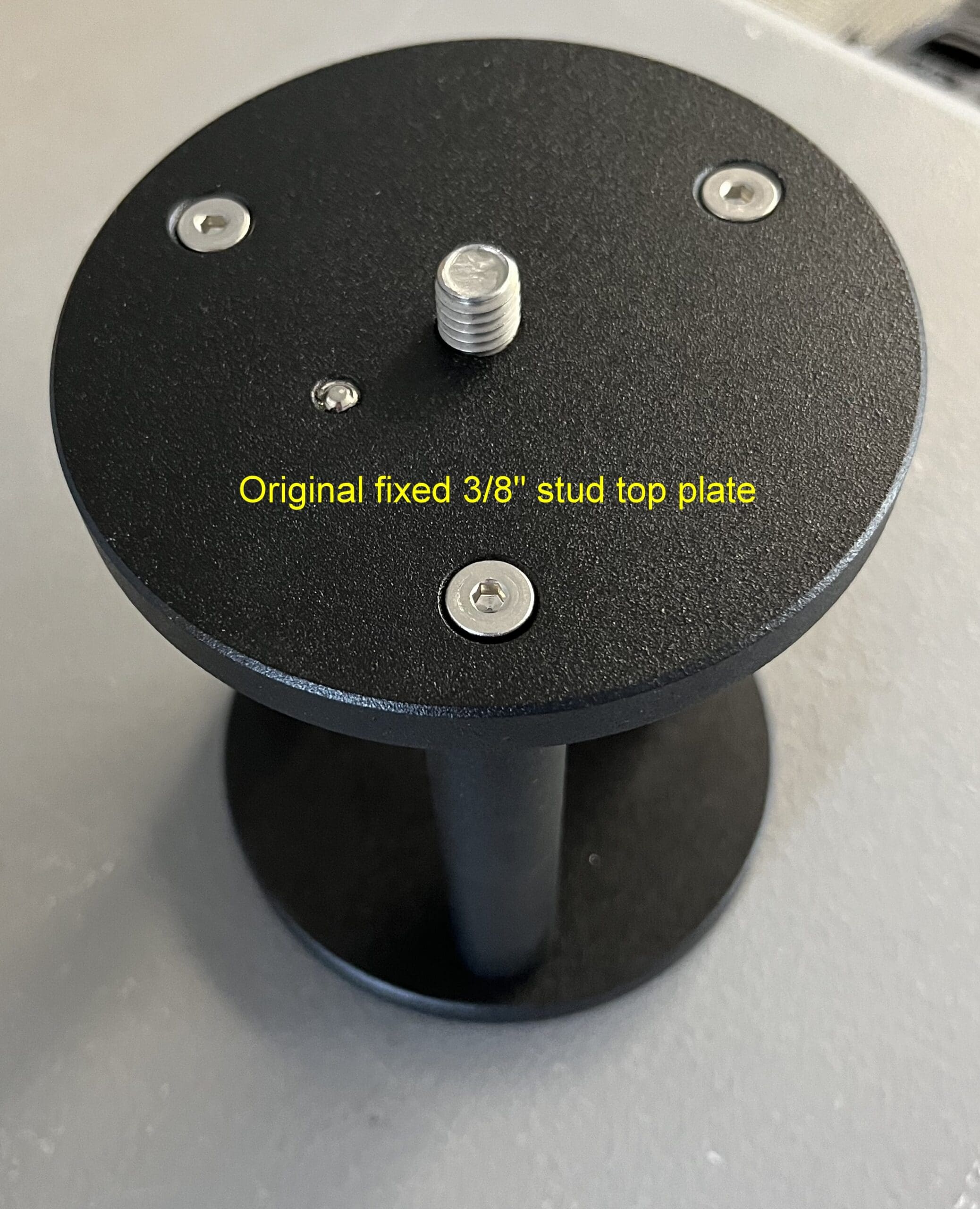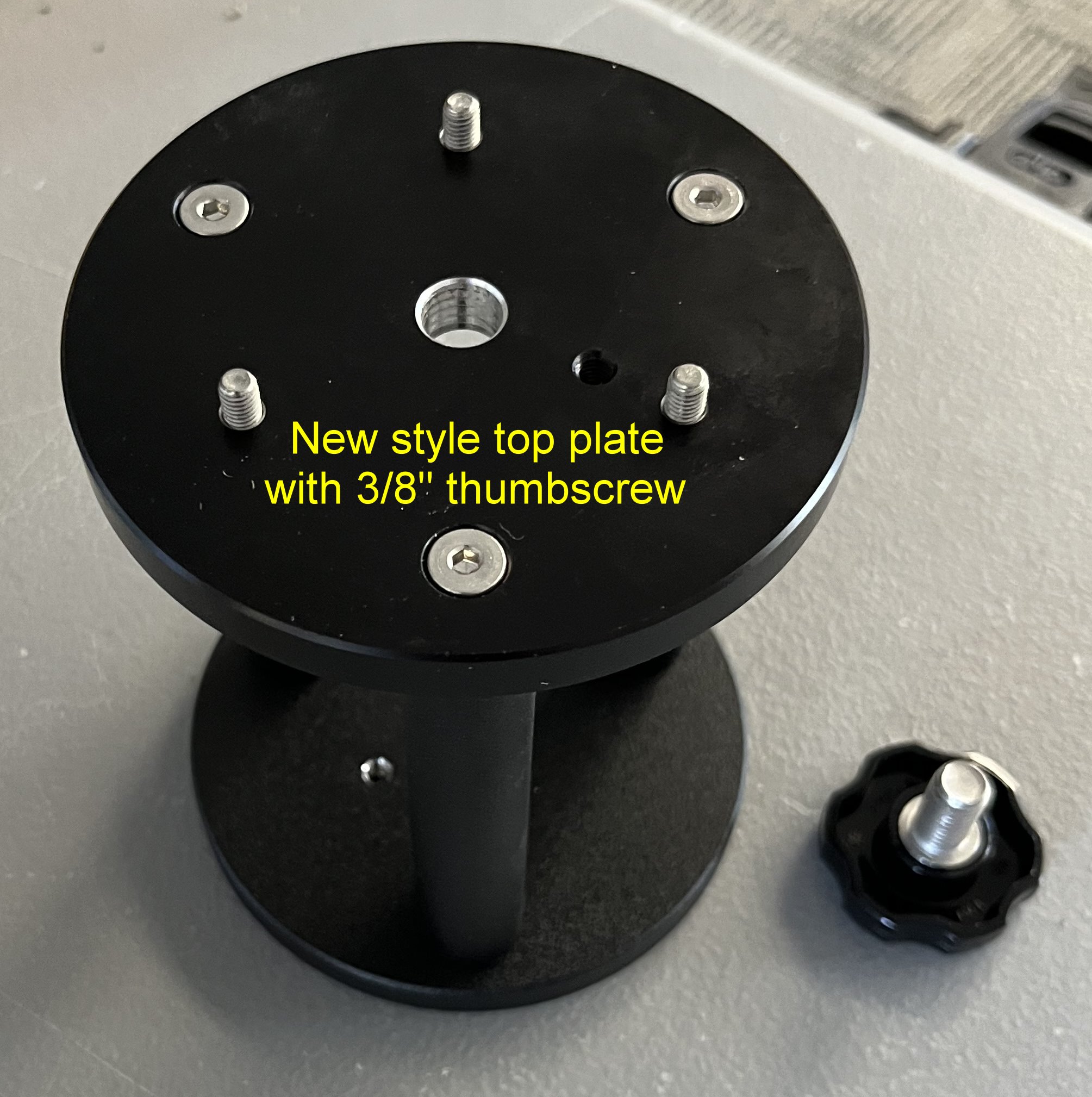 UPDATE: We now have two versions of the top plate to choose from. The original version is simply a plate with a fixed 3/8″ stud and a set-screw to prevent whatever is sitting on top of it from accidently unscrewing. The new top plate is intended for use with the iOptron HAZ31 and HAZ46. Rather than spinning the mount on and off (which can be awkward), the updated plate has three studs that precisely-match three holes in the bottom of the iOptron mount. There is a non-threaded hole in the center of the top plate and a 3/8″ thumbscrew is included. Simply set the mount on the pier with the three holes lined up with the three studs, then use the 3/8″ thumbscrew from underneath to secure the mount to the pier. It’s much easier and faster to attach/detach an iOptron mount this way.